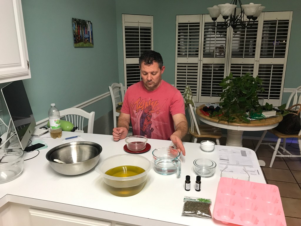 Derek is usually already on a conference call when I return. So it all works out until lunch time. For him that appears to be about 11:30am . And then he needs to walk and he is the slowest walker . Okay he wants a stroll and hold hands . Which is sweet. But I’m generally out there with a purpose. It is sweet that we go for a little walk . And about 3pm he needs a snack . My office is the kitchen . I see it and hear it all. And what’s for dinner ? Do you want to make soap ? Are you really working ? Go back to your office and take a nap !!!!