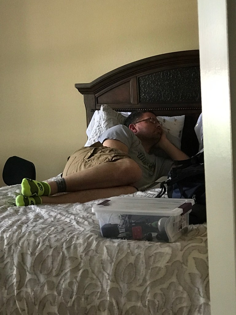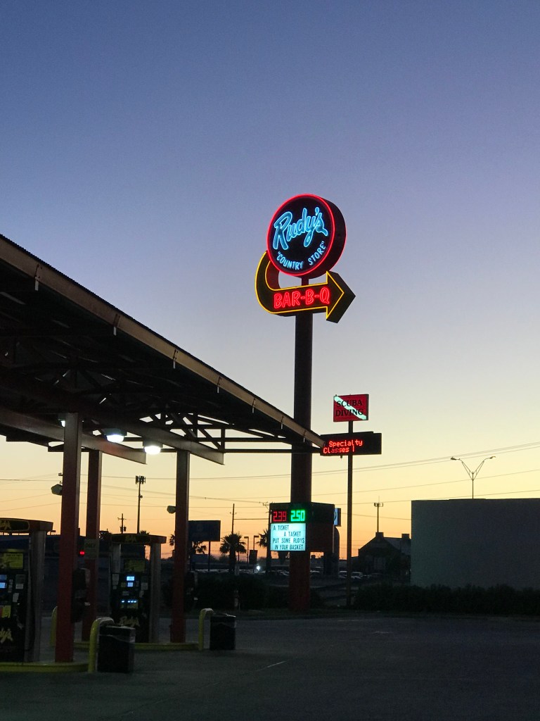 In the event you want to leave very early for a trip you should probably clue me in on this detail . From the change of 5am. Instead of ripping the covers off of me at 1 am and stating let’s go. Where I have no bag packed and hey it’s 1 am. So I had an idea what I was taking the bag wasn’t that big of a deal. But I am a person who needs their sleep or I do not function well and I tend to get sick. But I got in the truck with pillow and blanket and did my best to sleep until I saw sun and palm trees. And where I found Derek headed to Rudy’s  for a breakfast taco . Yes where I live it’s a Breakfast Burrito . But in Corpus it’s a taco so you just go with it.