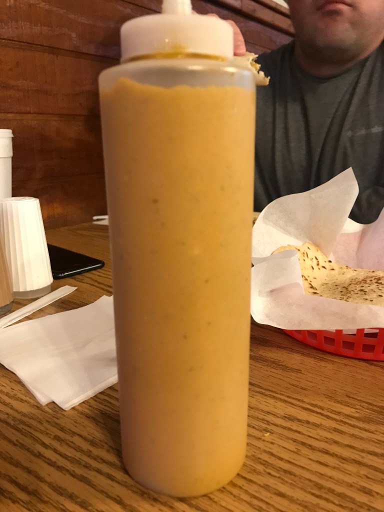 Sunday was Breakfast at Nana’s Taco Run . Which when we lived there was a Saturday thing I don’t even think we knew it was open on Sunday . But hot sauce is a strange yellow.  I can’t even tell you what it taste like nor can I tell you what’s in except maybe jalapeno. I don’t know. But it’s yummy .