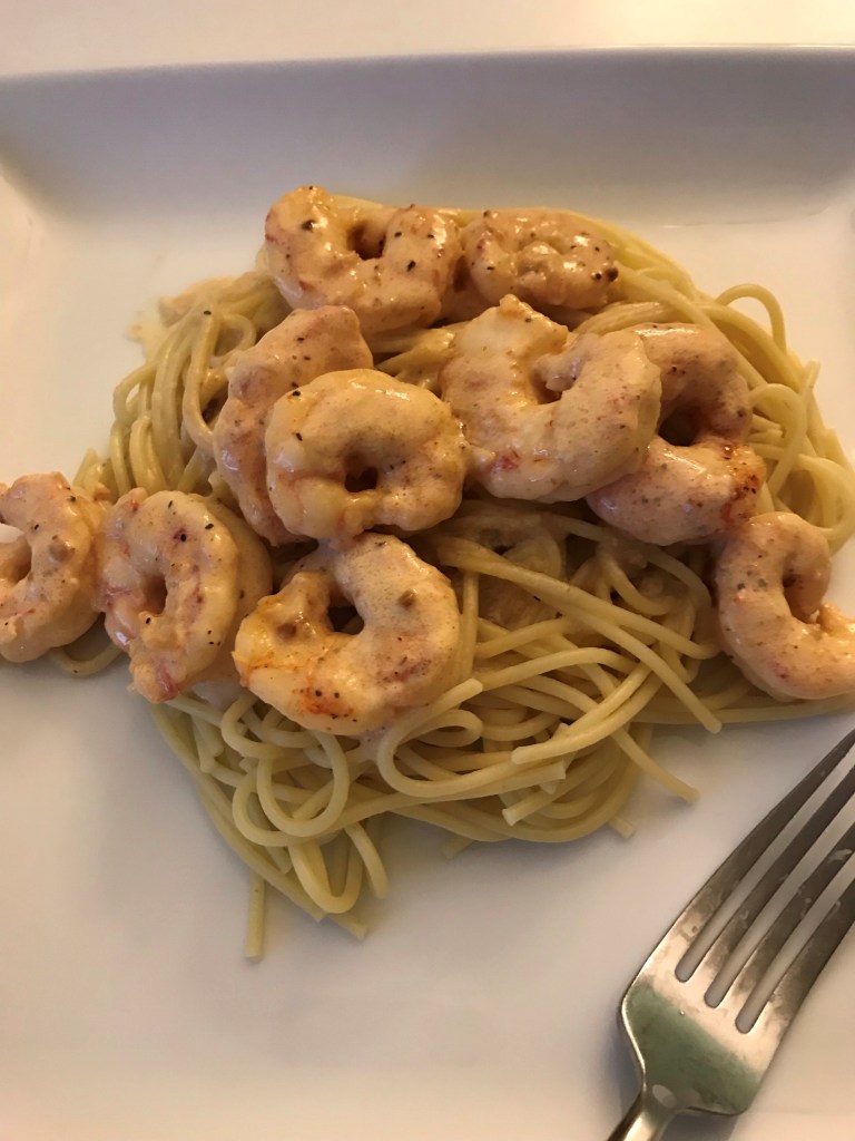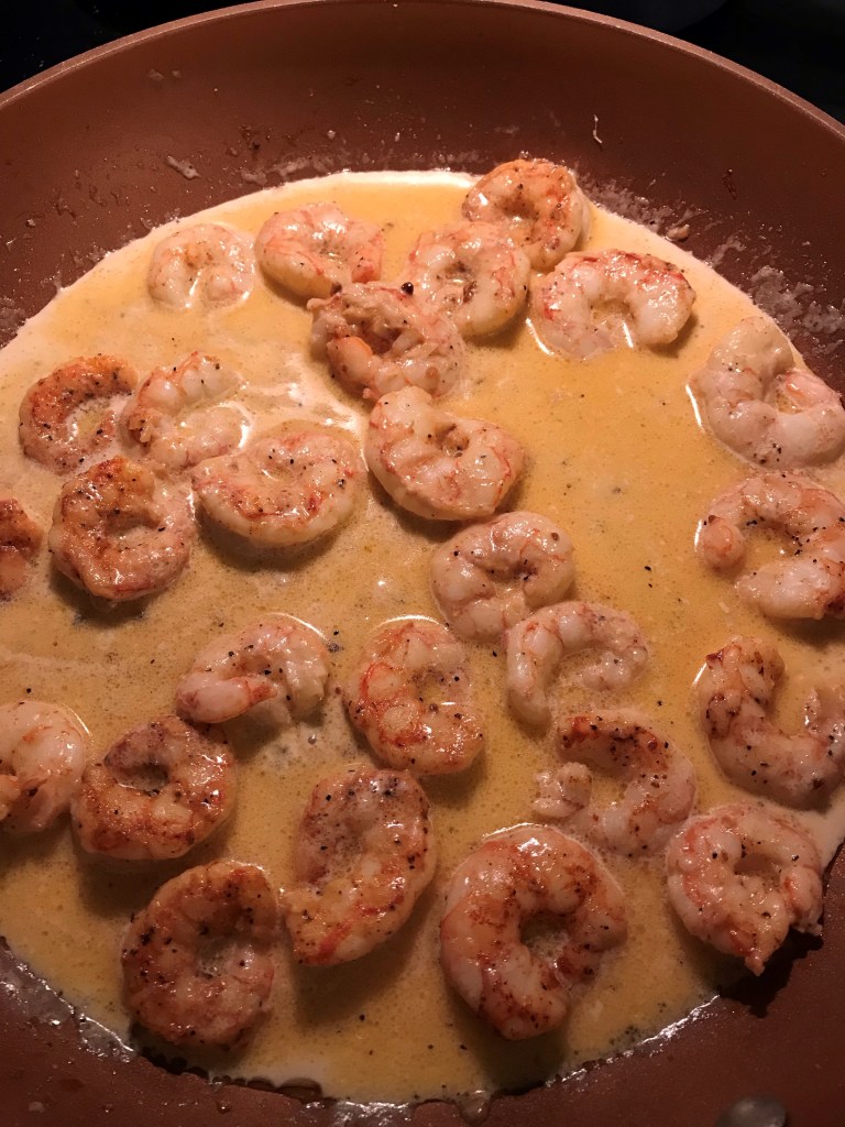 Derek and I went to plant some of the garden last night . Headed home the dreaded question “Whats for dinner? Shrimp. ” I don’t want that ” Well honey you pull right into that grocery store and see your other options. Shrimp , with Garlic Parmesan Cream Sauce over pasta. I didn’t really wanted but it pacified him.