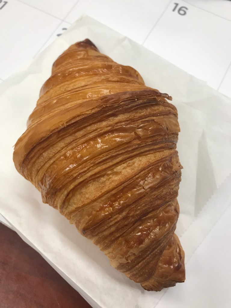 Yvette brought us HUGE croissants today . Mine was plain , Jordan was chocolate. Not sure what she had .